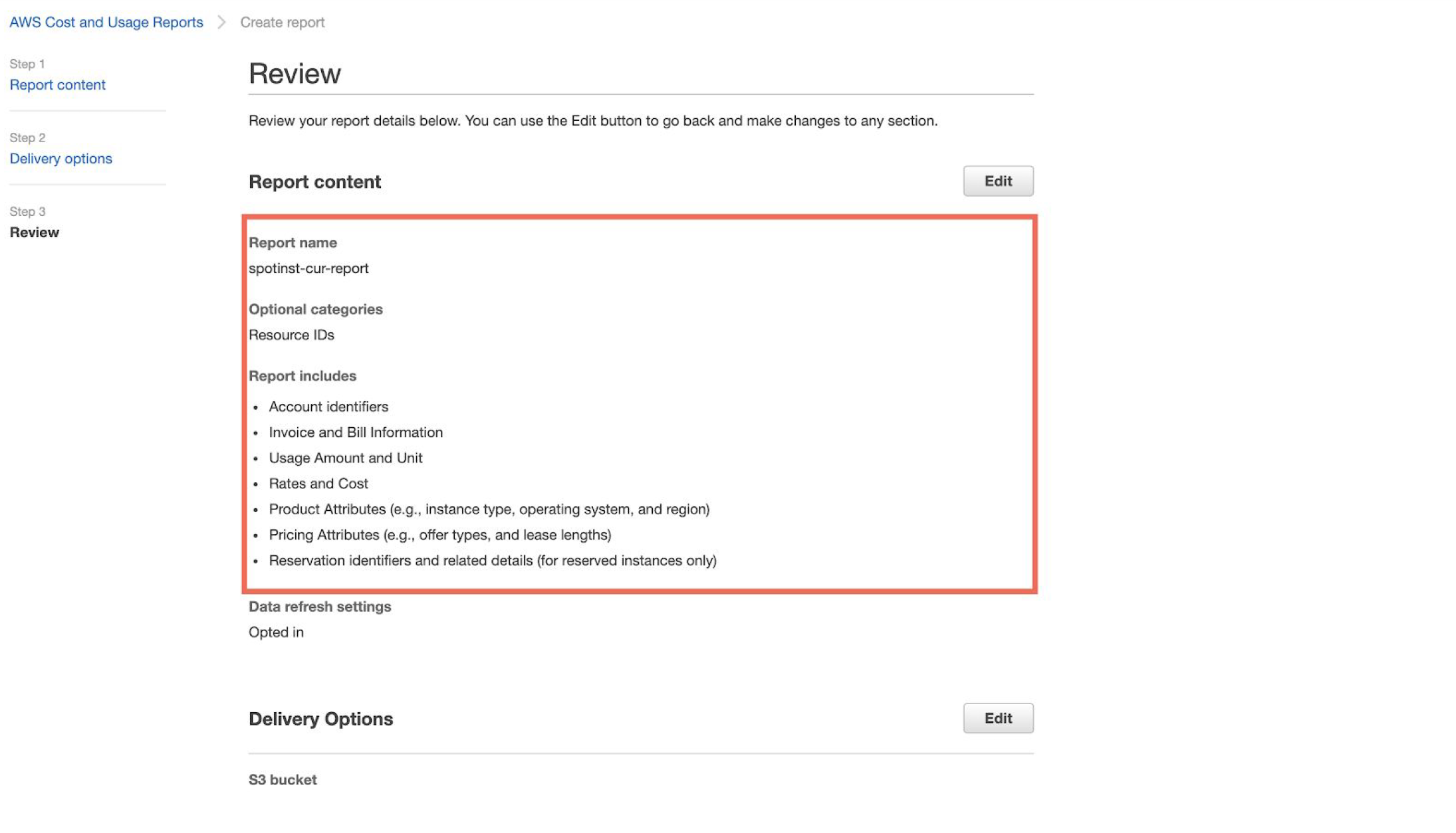 spotinst-cur-report. This name must be the same as the report name that you entered previously. - Only change the bucket's region if necessary.